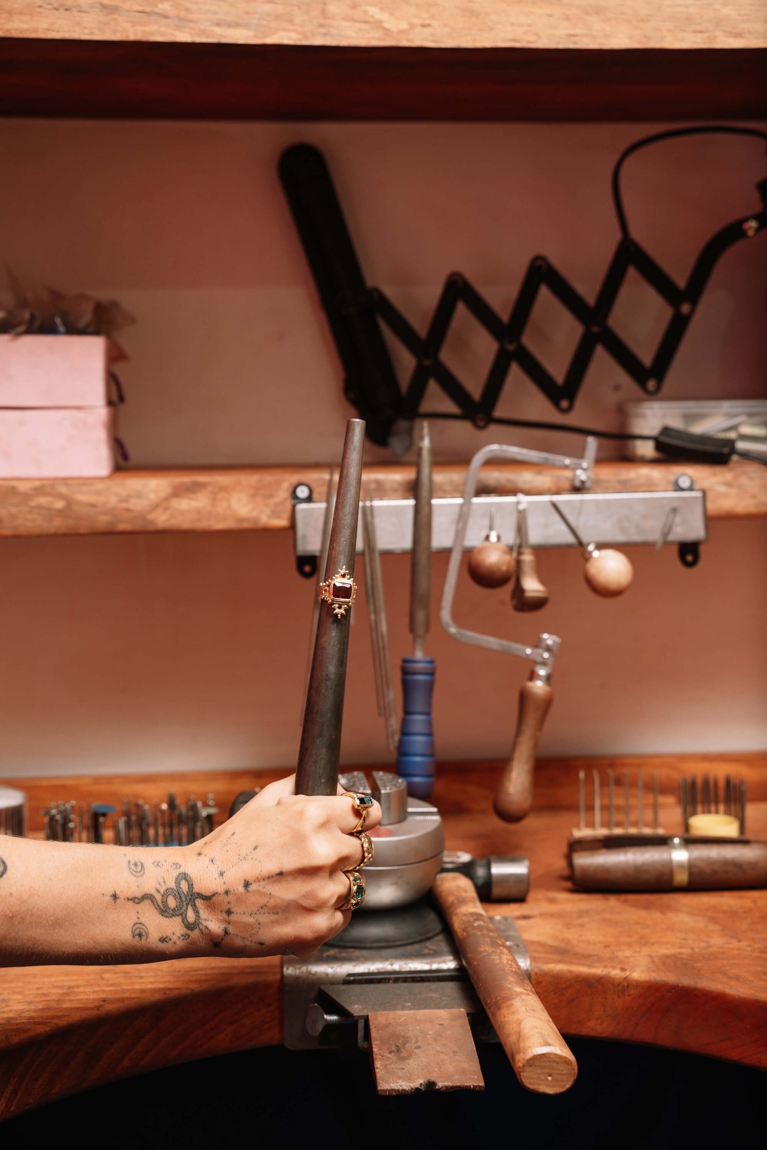 In 2020, after years of making jewellery in her bedroom, garage and converted garden sheds, Millie moved into a real studio with an adjoining shop in Brunswick. The space was a true labor of love - with friends and family chipping in to create the treasure trove of creativity and chaos, hallmarked by an unmissable pink and orange Minna Leunig mural.