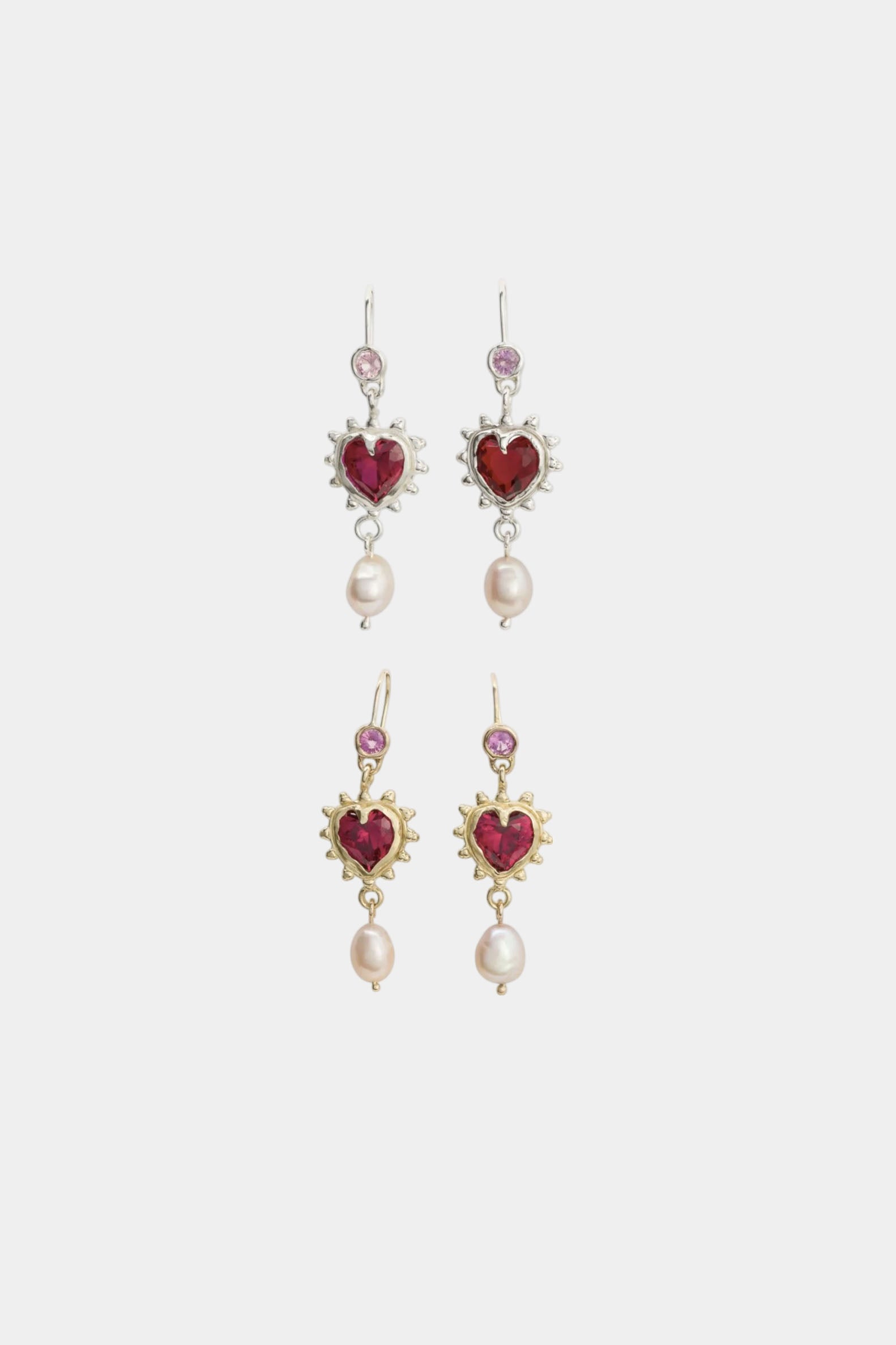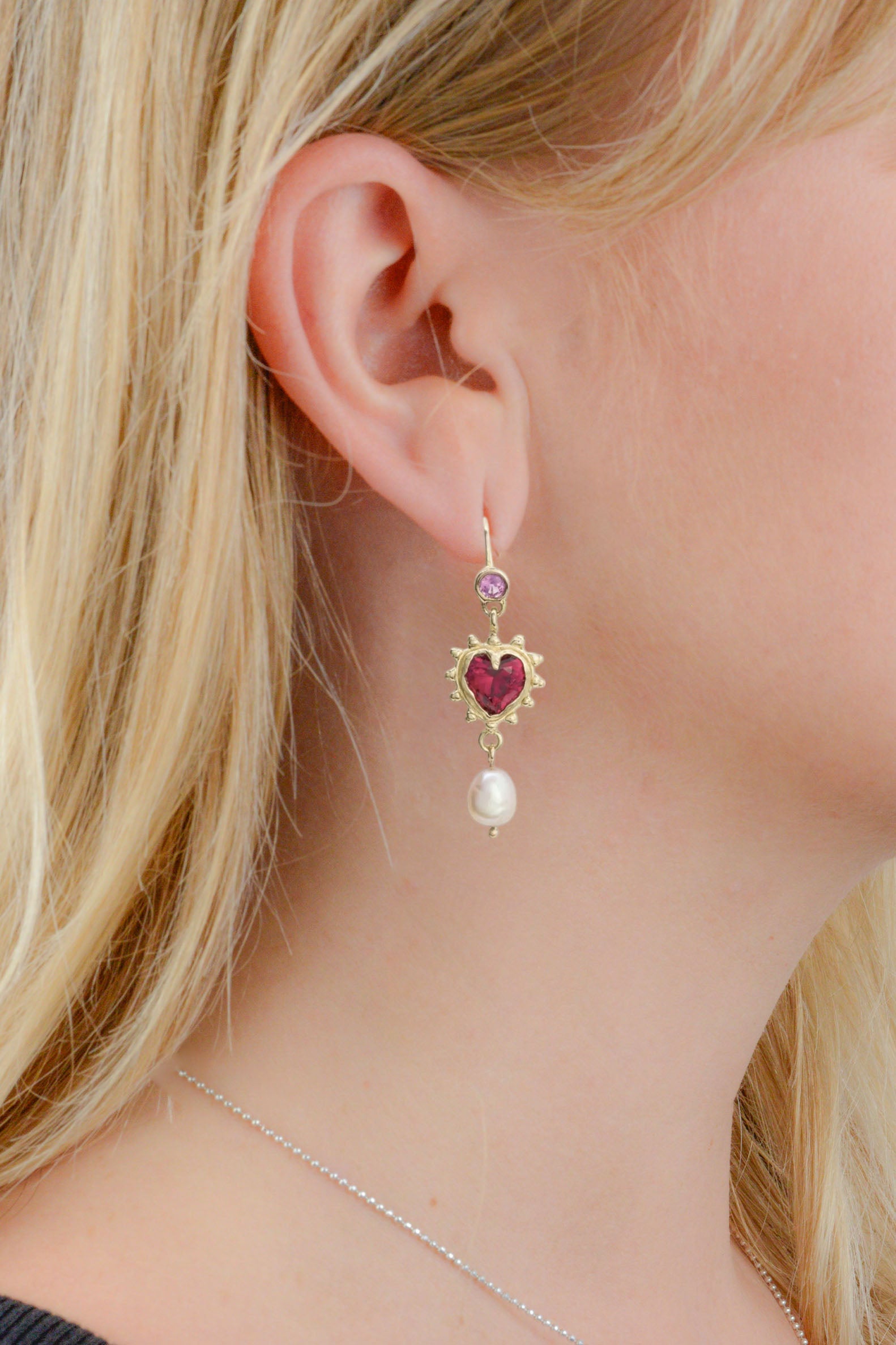 The I Love Pearls Earrings~ made from a natural pink sapphire, a nano ruby heart and a dangling pearl.