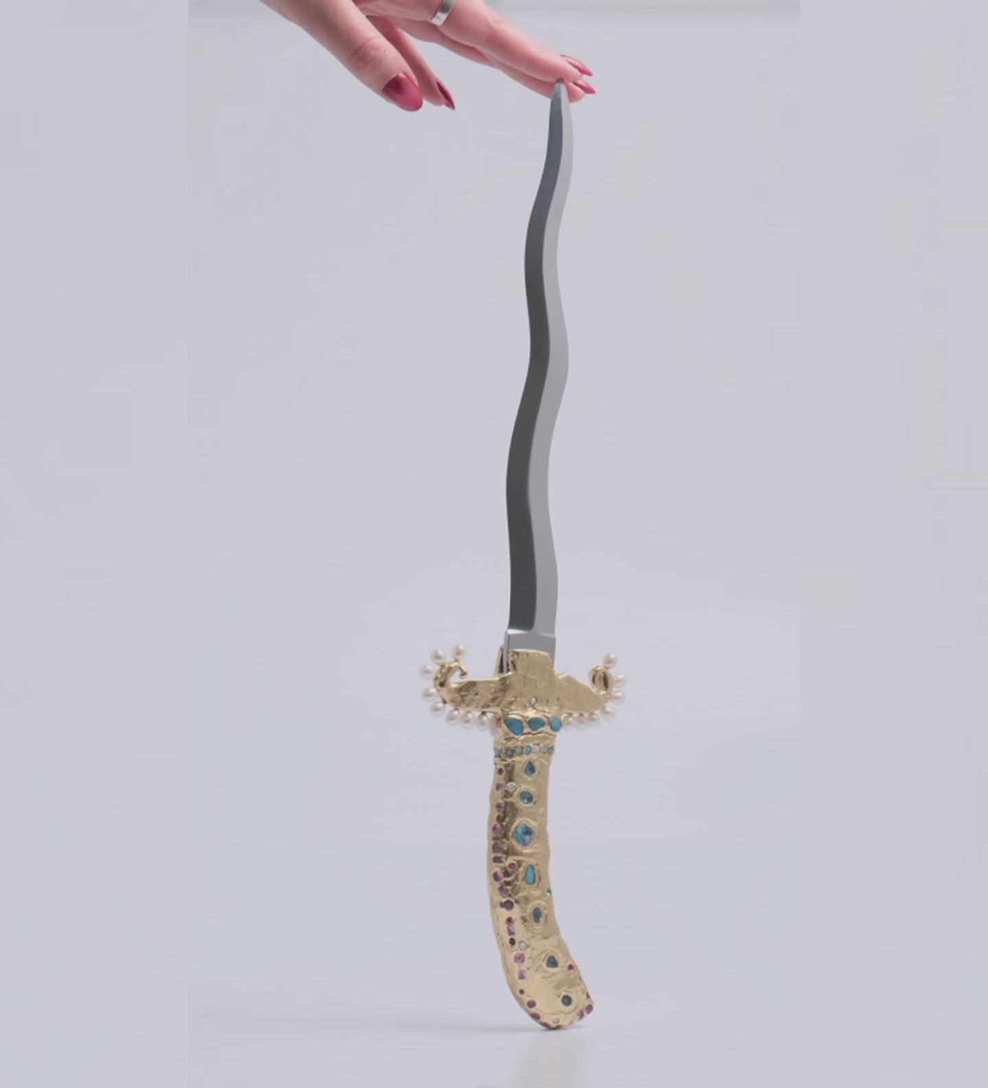 ~ Sterling silver plated in 18k yellow gold vermeil with a steel blade. Set with sapphires, topaz, appatite, Aussie opals and pearls.
