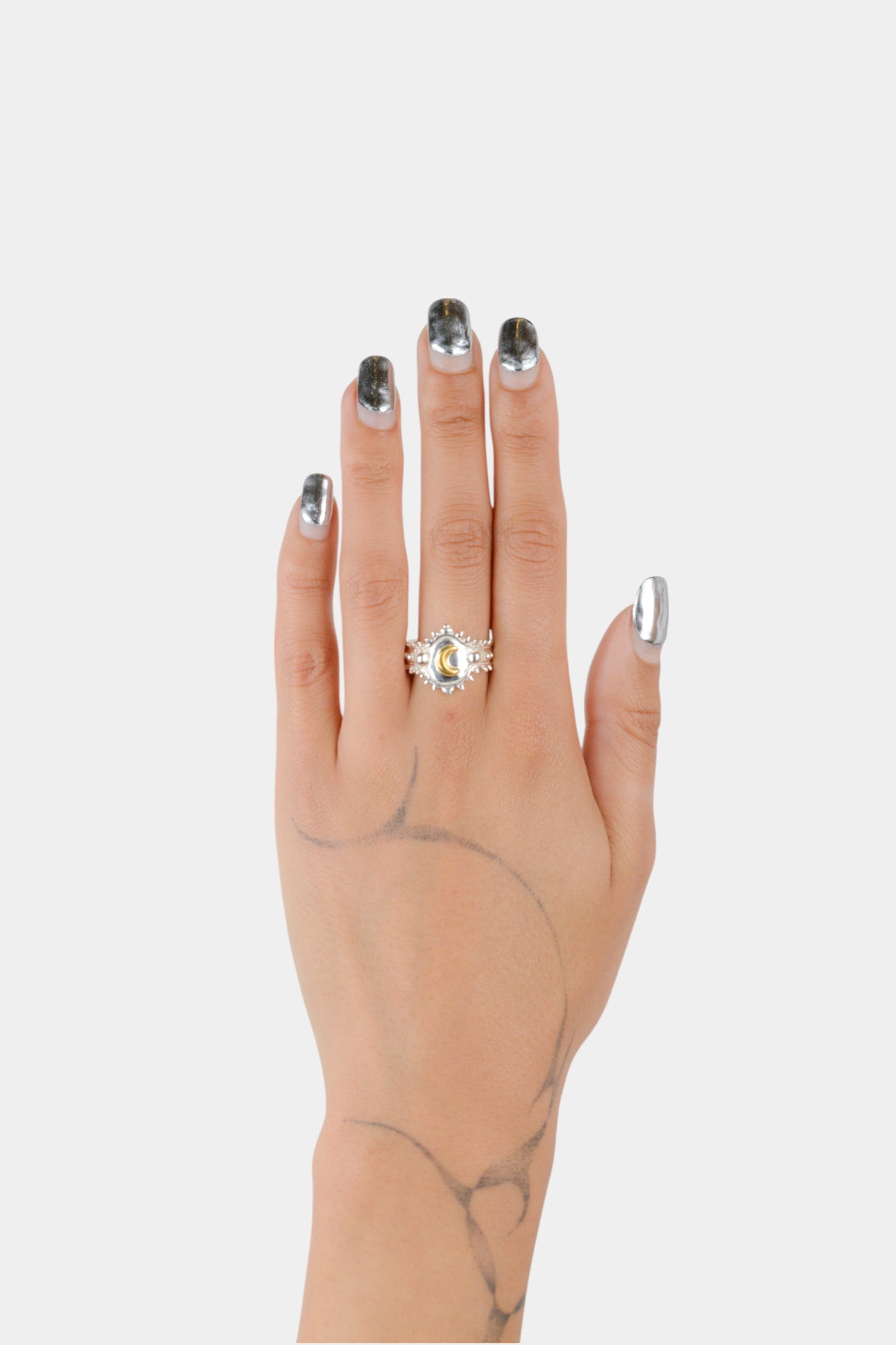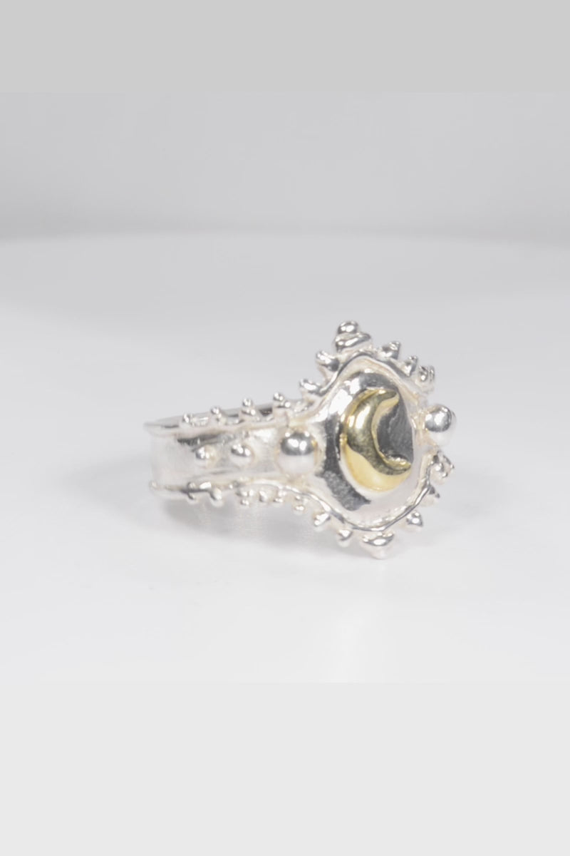 For the luna creatures, gold brass moon on a solid sterling silver ring.